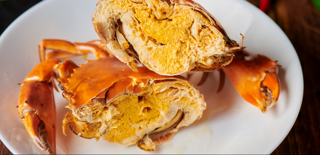 每逢炎夏,青母蟹會(huì)在產(chǎn)卵時(shí)棲身于淺灘河畔,在陽(yáng)光的照射下,體內(nèi)的蟹膏分解成金黃色的油脂,然后滲透到體內(nèi)的各個(gè)部分,使得整只蟹晶瑩剔透、充滿黃油,因此被稱為黃油蟹。